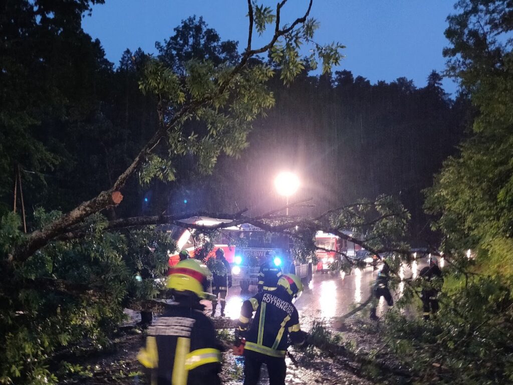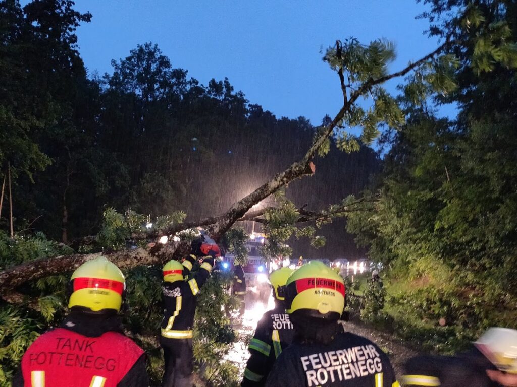 Das Gewitter am Freitagabend beendete abrupt einen sonnigen und heißen Badetag. Für viele Feuerwehrfrauen und -Männer in Oberösterreich brachte es vieles an Einsatzarbeit. So auch für die FF Rottenegg, die nach der FF Lacken zu einem Baumsturz im Saurüssel alarmiert wurde.