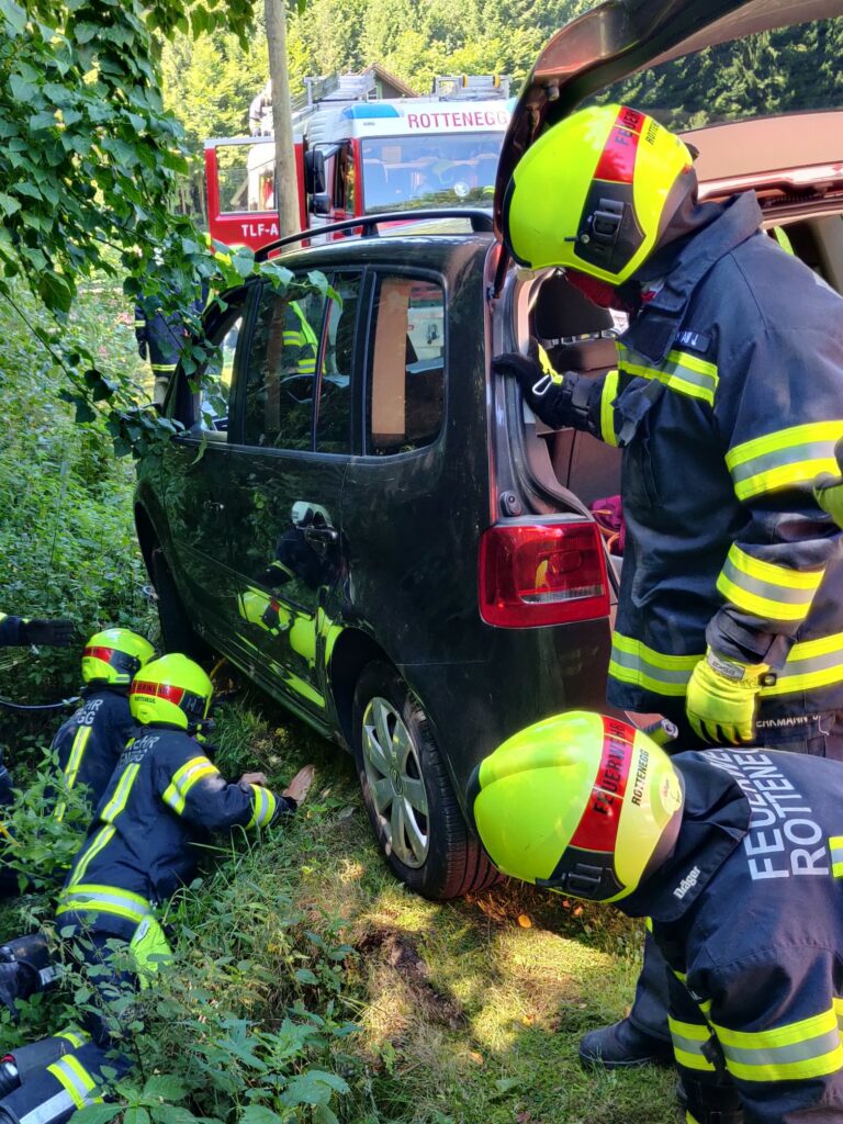 Kurz nach Mittag wurde die FF Rottenegg alarmiert wegen eines PKWs, der in der Sportplatzstraße in einen Bach abzurutschen drohte.